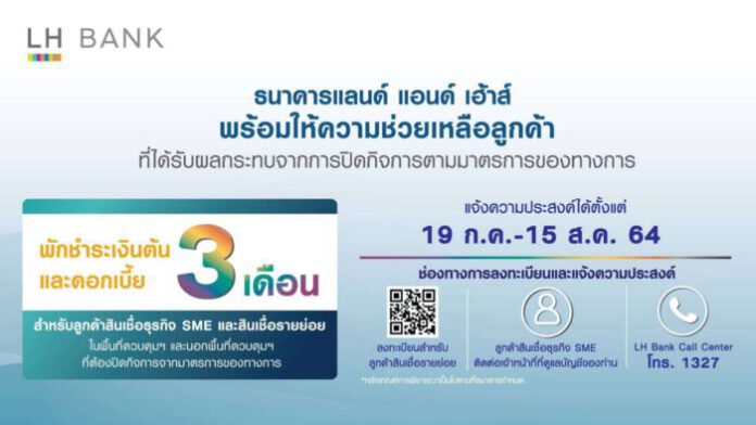 ชมภูนุช ปฐมพร กรรมการผู้จัดการ ธนาคารแลนด์ แอนด์ เฮ้าส์ จำกัด (มหาชน) หรือ LH Bank เปิดเผยว่า ธนาคารมีความตั้งใจอย่างเต็มที่ในการช่วยเหลือลูกค้าเพื่อให้ผ่านพ้นสถานการณ์ในครั้งนี้ไปได้ด้วยดี  และเห็นถึงความจำเป็นเร่งด่วนในการให้ความช่วยเหลือ ธนาคารจึงได้ออกมาตรการช่วยเหลือลูกค้ามาอย่างต่อเนื่อง  และในครั้งนี้ธนาคารได้ออกมาตรการพักชำระเงินต้นและดอกเบี้ย 3 เดือน เพื่อช่วยลูกค้าเอสเอ็มอีและรายย่อยเพื่อบรรเทาความเดือดร้อน โดยเริ่มตั้งแต่งวดการชำระหนี้เดือนกรกฎาคมนี้เป็นต้นไป โดยหลักเกณฑ์พิจารณาเป็นไปตามที่ธนาคารกำหนด ทั้งนี้ลูกค้าสามารถแจ้งความประสงค์ตั้งแต่วันที่ 19 กรกฎาคม – 15 สิงหาคม 2564”