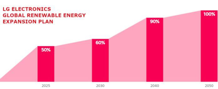 แอลจี อีเลคทรอนิคส์ (แอลจี) เปิดเผยถึงความมุ่งมั่นในการเปลี่ยนผ่านสู่การใช้พลังงานหมุนเวียนอย่างสมบูรณ์ภายในปี 2593 ซึ่งเป็นหนึ่งในกลยุทธ์ความยั่งยืน โดยการประกาศในรายงานความยั่งยืนของแอลจีนี้เป็นการสานต่อคำมั่นสัญญาก่อนหน้านี้ที่ตั้งเป้าบรรลุความเป็นกลางทางคาร์บอนภายในปี 2573 ผ่านโครงการ Zero Carbon 2573 ซึ่งแอลจีให้คำมั่นว่าจะลดการปล่อยคาร์บอนในขั้นตอนการผลิตเป็น 50% ของมาตรฐานปี 2560 ภายในปี 2573