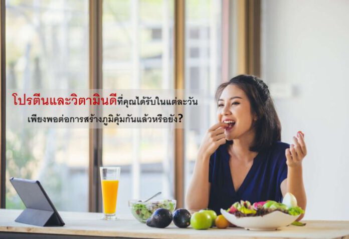 โปรตีน (Protein) เป็นสารอาหารหลักที่คอยทำหน้าที่สร้างเสริมและซ่อมแซมเนื้อเยื่อและเซลล์ร่างกายที่เสื่อม โดยเฉพาะเซลล์ในระบบภูมิคุ้มกัน หากไม่ได้รับโปรตีนในปริมาณที่เพียงพอ ร่างกายจะมีประสิทธิภาพของระบบภูมิคุ้มกันที่ลดลง ไม่เพียงพอต่อการต้านทานการติดเชื้อโรคต่าง ๆ ได้ เราจึงมีความต้องการโปรตีนที่เพิ่มมากขึ้น ในช่วงเวลาที่ต้องสร้างภูมิคุ้มกันเพื่อต่อสู้กับเชื้อโรค เชื้อไวรัสต่าง ๆ รวมไปถึงช่วงการฟื้นฟูร่างกายจากอาการเจ็บป่วยต่างๆ แต่ในขณะเดียวกัน อายุที่เพิ่มมากขึ้น ก็ส่งผลต่อทั้งการย่อยและการดูดซึมโปรตีนของร่างกาย ดังนั้น คนในวัยผู้ใหญ่จึงควรบริโภคโปรตีนเพิ่มมากขึ้น เพื่อรักษาสุขภาพที่ดี หายจากอาการเจ็บป่วยได้ไวขึ้น รวมไปถึงรักษามวลกล้ามเนื้อและการทำงานของกล้ามเนื้อให้เป็นปกติอีกด้วย