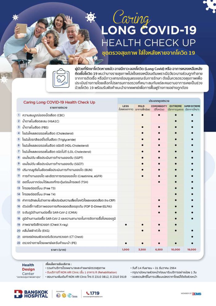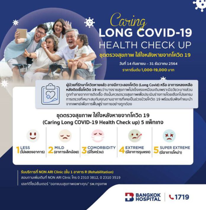 ชุดตรวจสุขภาพ Caring Long COVID-19 Health Check up  ให้คุณพร้อมกลับมาทำงานอย่างอุ่นใจ (Return to Work) สร้างความมั่นใจที่กลับมาใช้ชีวิตได้ปกติ ด้วยรายการตรวจสุขภาพ เช่น ตรวจระดับน้ำตาลและไขมันในเลือด  เอนไซม์ตับ เพื่อประเมินการทำงานของตับ (SGPT/ SGOT) ค่าครีเอตินีนเพื่อตรวจประเมินการทำงานของไต และอัตราการกรองของไต ฮอร์โมนไทรอยด์ ค่าการอักเสบในร่างกาย เพื่อประเมินความเสี่ยงโรคหัวใจและหลอดเลือด ตัวบ่งชี้ทางชีวภาพของการเกิดหลอดเลือดอุดตัน ระดับภูมิต้านทานต่อเชื้อ SAR-CoV-2 (IgM / IgG)  ความสามารถในการจัดการเชื้อโรคของภูมิ (Neutralizing Antibody) เอกซเรย์ปอด ตรวจคลื่นไฟฟ้าหัวใจ หรือเอกซเรย์คอมพิวเตอร์ พร้อมการตรวจประเมินร่างกายและรับคำแนะนำจากแพทย์เพื่อการฟื้นฟูร่างกายอย่างถูกต้อง  เลือกโปรแกรมที่เหมาะสมกับคุณ ในราคา 1,000 บาท 3,500 บาท 6,500 บาท 10,000 บาท  และ 19,000  บาท  รับบริการได้ที่ NON ARI Clinic (ชั้น 1 อาคาร R (Rehabilitation) ตั้งแต่วันที่ 20 กันยายน – 31 ธันวาคม 2564  กรุณานัดหมายล่วงหน้าก่อนมารับบริการอย่างน้อย 1 วัน สอบถามเพิ่มเติม โทร 0 2310 3812,  0 2310 3519