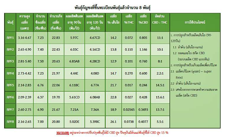 “ปัจจุบัน สวพส. และมูลนิธิโครงการหลวง อยู่ระหว่างการปรับปรุงพันธุ์ให้กัญชงที่มีปริมาณ CBD สูง และ THC ต่ำกว่า 1.0% ซึ่งในปัจจุบัน พบสายพันธุ์ที่มีปริมาณ CBD เพิ่มสูงขึ้นในช่วง 5-15 % โดยอยู่ระหว่างขั้นตอนการปลูกทดสอบและปรับปรุงพันธุ์ โดยมีเป้าหมายให้ได้พันธุ์ที่มีปริมาณ CBD 20% ภายในปี พ.ศ. 2570 และปัจจุบัน มีพันธุ์กัญชงที่ขึ้นทะเบียนพันธุ์แล้วจำนวน 8 พันธุ์ ได้แก่ RPF1 , RPF2 , RPF3 , RPF4 , RPF5 , RPF6 , RPF7 และ RPF8 ซึ่งขณะนี้อยู่ระหว่างการสำรวจปริมาณและคุณภาพของเมล็ด โดยคาดว่าทาง สวพส. เปิดจำหน่ายเมล็ดกัญชง (Hemp) ครั้งที่ 2 ประมาณปลายปี พ.ศ. 2564 นี้ โดยสามารถติดตามข่าวสารต่าง ๆ ของ สถาบันฯ ผ่านเว็บไซต์ https://www.hrdi.or.th/ หรือ Facebook Fan page : สถาบันวิจัยและพัฒนาพื้นที่สูง(องค์การมหาชน) ” ดร.สริตา กล่าวทิ้งท้าย