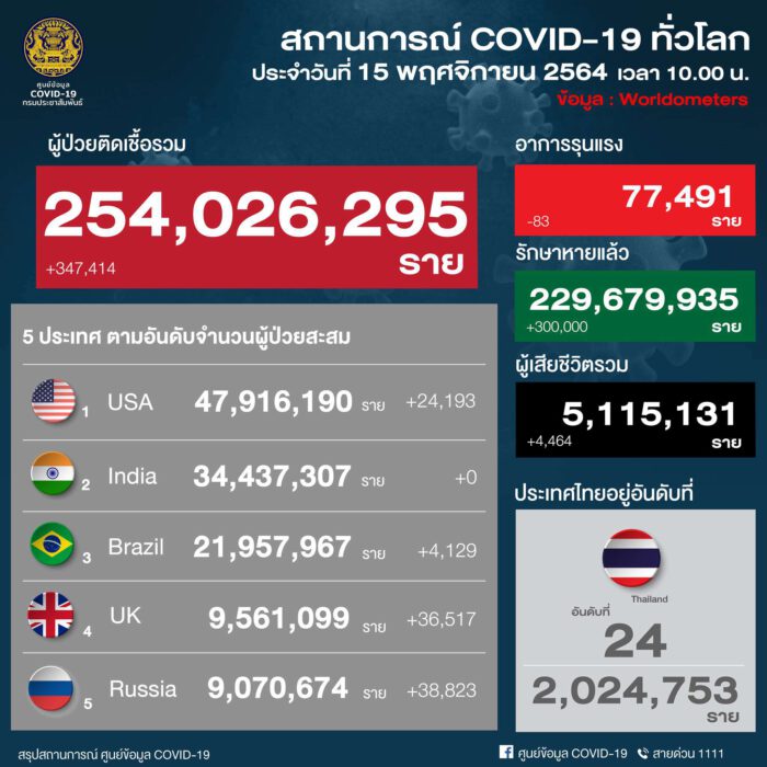 ประเทศไทยอยู่ในอันดับที่ 24 จำนวน 2,024,753 ราย
