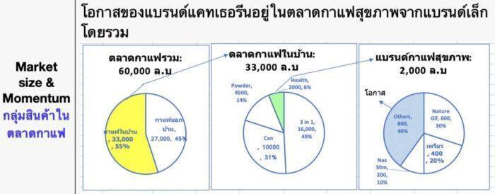 มูลค่าตลาดกาแฟเพื่อสุขภาพในประเทศมีถึง 2,000 ล้านบาท แบรนด์ “แคทเธอรีน” เราตั้งเป้ามีแชร์จากตลาด 10% ประมาณ 200 ล้านบาทในปีนี้ ที่ผ่านมา “แคทเธอรีน” ยังอยู่ในช่วงเริ่มสร้างแบรนด์ และยังมีฐานที่เล็กอยู่มาก จึงมีการเติบโตแบบก้าวกระโดด 2 เท่าจากยอดขายเดิมในปีที่แล้ว (ในปีที่ผ่านมาเติบโตจริงถึง +75% )