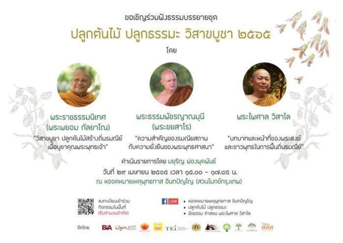 มูลนิธิปลูกต้นไม้ ปลูกธรรมะ ขอเชิญชวนพุทธศาสนิกชนร่วมงานแสดงธรรมบรรยายชุด “ปลูกต้นไม้ ปลูกธรรมะ วิสาขบูชา 2565” โดย พระราชธรรมนิเทศ (พระอาจารย์พยอม กัลยาโณ) เรื่อง “วิสาขบูชา ปลูกต้นไม้ สร้างถิ่นรมณีย์เพื่อบูชาคุณพระพุทธเจ้า” พระธรรมพัชรญาณมุนี (พระอาจารย์ชยสาโร) เรื่อง “ความสำคัญของรมณียสถานกับความยั่งยืนของพระพุทธศาสนา” พระอาจารย์ไพศาล วิสาโล เรื่อง “บทบาทและหน้าที่ของพระสงฆ์และชาวพุทธในการฟื้นถิ่นรมณีย์” จัดขึ้นวันศุกร์ที่ 29 เมษายน 2565 เวลา 15.00-17.45 น. ณ หอจดหมายเหตุพุทธทาส อินทปัญโญ (สวนโมกข์กรุงเทพ)