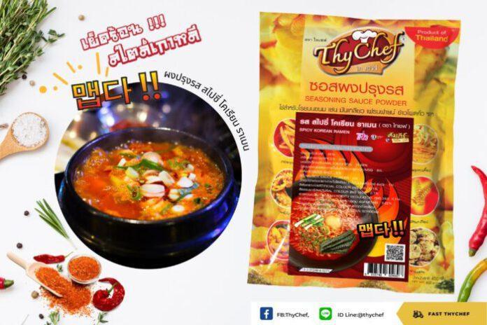 แบรนด์ไทเชฟ (ThyChef) ผู้นำด้านผงโรยอาหารและผงชงเครื่องดื่มหลากหลายรสชาติ จึงเอาใจสาวกเกาหลีด้วยผลิตภัณฑ์ใหม่ล่าสุด ผงปรุงรส สไปซี่ โคเรียน ราเมน แบบฉบับต้นตำรับ ที่มาพร้อมรสชาติเผ็ดร้อน จัดจ้าน สไตล์เกาหลี ด้วยขั้นตอนการทำได้แบบง่าย ๆ เพียงฉีกซองผงปรุงรสฯ แล้วนำไปโรยหรือคลุกเคล้ากับอาหารที่ปรุงสุกแล้ว อาทิ บะหมี่กึ่งสำเร็จรูป ป๊อปคอร์น ไก่ทอด เฟรนช์ฟรายส์ หรือมันเกลียว ฯลฯ เพียงเท่านี้ก็จะได้เมนูใหม่ที่อร่อยเด็ด เผ็ดกว่าเดิม แซ่บเวอร์ถึงใจ ได้กลิ่นไอเกาหลีแบบเต็ม ๆ เหมาะสำหรับผู้ที่ชื่นชอบอาหารเกาหลีเป็นชีวิตจิตใจ และพ่อค้า-แม่ค้าที่สามารถนำไปต่อยอดเพื่อสร้างกำไรงาม ๆ แบบไม่ต้องบินไกลไปถึงเกาหลี