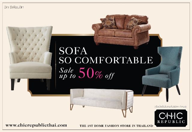 บมจ.ชิค รีพับบลิค (CHIC) จัดแคมเปญกระตุ้นยอดขายช่วงโค้งสุดท้ายไตรมาสแรก เปิดตัวแคมเปญ ‘Sofa So Comfortable Sale Up to 50%’ มอบข้อเสนอสุดร้อนแรง ซื้อสินค้าแบรนด์ ชิค รีพับบลิค รับส่วนลดสูงสุด 50% เริ่มจัดรายการแล้ววันนี้-30 เมษายน 2561 ณ โฮมแฟชั่นสโตร์ ชิค รีพับบลิค ทุกสาขา