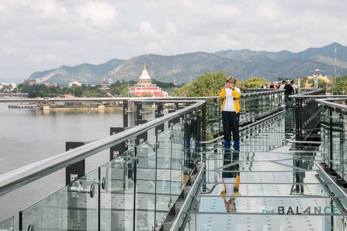 กินลมชมวิวมุมมองใหม่ที่ “สกายวอล์กกาญจนบุรี”  ที่เพิ่งเปิดตัวไปเมื่อเดือนกันยายน 2565  ริมท่าน้ำในตัวเมืองกาญ เป็นสะพานสูง 12 เมตร ระยะทาง 150 เมตร ชวนกันเดินขึ้นอาคาร 4 ชั้นแล้วออกไปชมวิวมุมสูงได้อย่างเต็มตา มองเห็นแม่น้ำแม่กลอง แม่น้ำแควน้อย พระพุทธรูปปางประทานพร วัดถ้ำเขาแหลม หอพระประวัติสมเด็จพระญาณสังวร สมเด็จพระสังฆราช สกลมหาสังฆปริณายก ทั้งสองฝั่งจะมีฉากหลังเป็นภูเขาสวยงาม เบื้องล่างเป็นผืนน้ำขนาดใหญ่ มีเรือนแพของบรรดาร้านอาหารและชุมชนริมน้ำเรียงรายอย่างเป็นระเบียบ