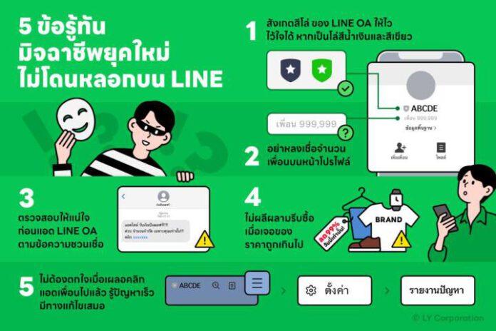 LINE ประเทศไทย ในฐานะแพลตฟอร์มดิจิทัลหลักของคนไทย ที่ให้ความสำคัญกับการใช้งานอย่างปลอดภัย จึงขอแนะ 5 ข้อเตือนภัย รู้ทันมิจฉาชีพยุคใหม่ ไม่ให้ผู้ใช้ตกเป็นเหยื่อหรือโดนหลอกบน LINE ดังนี้