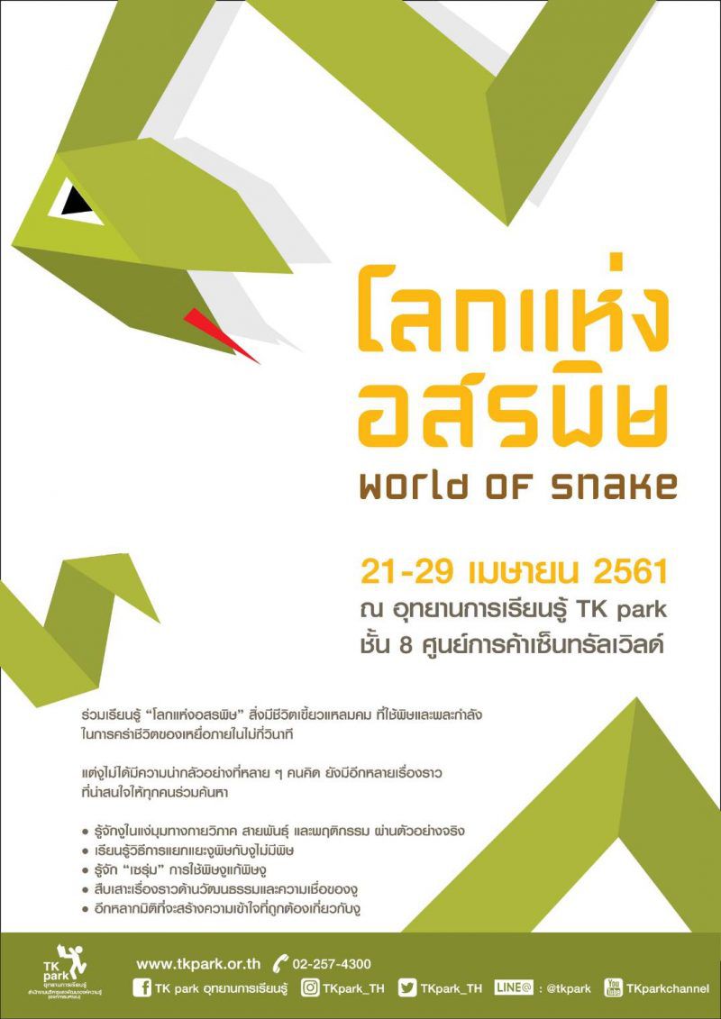 อุทยานการเรียนรู้ TK park ร่วมกับ สถานเสาวภา สภากาชาดไทย และสำนักงานกองทุนสนับสนุนการวิจัย (สกว.) ชวนเด็กและเยาวชน รวมถึงผู้สนใจทั่วไปมารู้จัก “งู” ผ่าน นิทรรศการ “โลกแห่งอสรพิษ” และฐานกิจกรรมที่หลากหลาย ซึ่งจะพาทุกคนเข้าไปสู่โลกของอสรพิษ “งู” สิ่งมีชีวิตเขี้ยวแหลมคมที่ใช้พิษและพละกำลังในการคร่าชีวิตของเหยื่อภายในไม่กี่วินาที รู้จัก “งู” ในแง่มุมทางกายวิภาค สายพันธุ์ และพฤติกรรม ผ่านตัวอย่างจริงทั้ง งูไทย อย่าง  งูเห่า, งูสามเหลี่ยม, งูทับสมิงคลา, งูเขียวหางไหม้, งูปล้องทอง, งูเขียวพระอินทร์, งูแสงอาทิตย์, งูก้นขบ และ งูปี่แก้ว งูต่างประเทศ ได้แก่ Black milk snake, Mexican Black king snake, Ball python, Corn snake, Milk snake และ Hog-nose snake พบกับหลากหลายเรื่องราวที่น่าสนใจให้ทุกคนร่วมค้นหา และสร้างความเข้าใจที่ถูกต้องเกี่ยวกับงู อาทิ วิธีการแยกแยะงูพิษกับงูไม่มีพิษ  รู้จัก “เซรุ่ม” การใช้พิษงูแก้พิษงู รวมถึงเรื่องราวด้านวัฒนธรรมและความเชื่อของงู