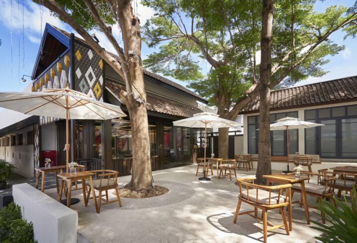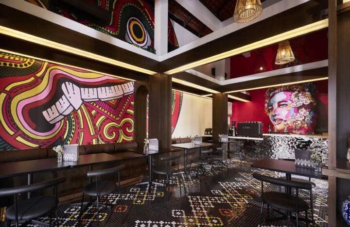 บนผนังใจกลางคาเฟ่ด้านในมีภาพวาดนารีสวมชฎาที่ได้รับแรงบันดาลใจมาจากนางมโนราห์ซึ่งเป็นศิลปะการแสดงพื้นเมืองอันเป็นเอกลักษณ์ของภาคใต้ประดับอยู่อย่างโดดเด่น สื่อถึงวัฒนธรรมอันงดงามในสไตล์อันทันสมัย ในขณะที่พื้นที่ภายนอกของคาเฟ่ เปิดเป็นที่นั่งจิบกาแฟเอาท์ดอร์