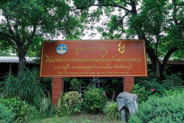 เราสามารถเข้าไปเรียนรู้และเลือกซื้อผลิตภัณฑ์ทองเหลือง ซึ่งมีมากมายหลายรูปแบบได้ที่ “วิสาหกิจชุมชนศูนย์การเรียนรู้ศิลปะหัตถกรรมหล่อทองเหลืองบ้านท่ากระยาง” ทั้งส่วนของโรงงานและโชว์รูมสินค้า โดยยายฮวยได้ก่อร่างสร้างตัวในการทำทองเหลืองมากว่า 50 ปี มีการใช้แรงงานช่างในชุมชน จนเกิดเป็นโรงงานขนาดใหญ่