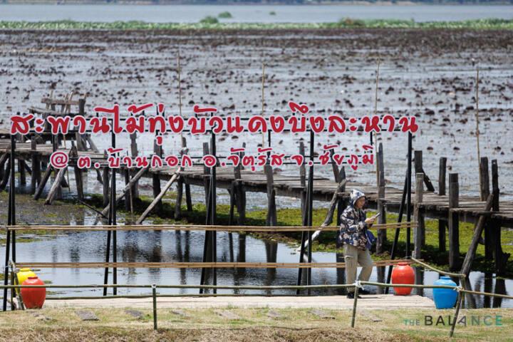 สะพานไม้กว่า 450 เมตร ทอดยาวลงไปในบึง ในช่วงเช้าตรู่ดอกบัวจะผลิบานไปจนถึงยามสาย แต่ก็เหมาะที่จะมาเที่ยวชมรับอากาศโล่ง ๆ โปร่งสบายกันได้ทั้งวัน ถ้าเป็นวันเสาร์-อาทิตย์ ก็จะมีชาวบ้านมาออกร้านขายปลาเผา ข้าวเหนียว ส้มตำ แวะมาแซ่บกันได้ที่ริมบึง