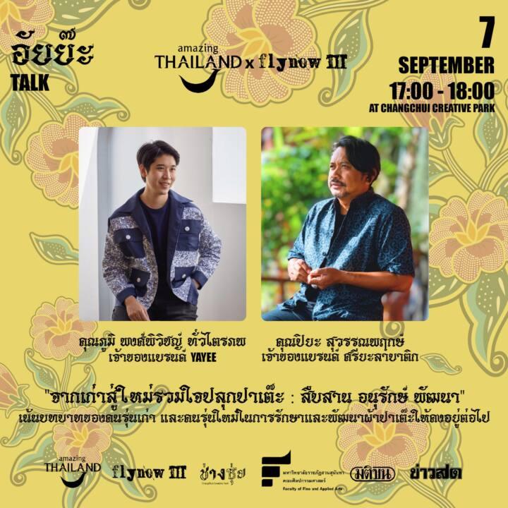 นิทรรศการที่บอกเล่าเรื่องราวกว่าจะเป็นแฟชั่นพิเศษจาก FlynowIII รับชมการแสดงศิลปวัฒนธรรมภาคใต้หาชมยากในโซน “อัยย๊ะ Southern Performance” เพลินไปกับดนตรีจากศิลปินอินดี้ยุคใหม่ในโซน “อัยย๊ะ Music” ที่นำเพลงใต้มาเรียบเรียงในสไตล์เฉพาะตัว พร้อมเสพงานศิลป์จากศิลปินปักษ์ใต้ในโซน “อัยย๊ะ Art” ล้อมวงพูดคุยเรื่องผ้าพื้นเมืองภาคใต้จากกูรูประวัติศาสตร์และดีไซเนอร์แฟชั่นร่วมสมัย และร่วมสนุกในโซน “อัยย๊ะ Workshop” เพลิดเพลินกับเวิร์คช็อปหัตถศิลป์ของชาวใต้ ปิดท้ายความฟินไปกับ “อัยย๊ะ Market” รวมเมนูพื้นบ้านอาหารพื้นเมืองของภาคใต้ ใครได้ลองแล้วจะติดใจในความหรอยแรง!