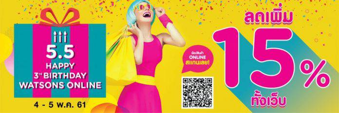 เตรียมช้อปกันให้ฉ่ำ กระหน่ำจิ้มกันให้ฟิน วัตสัน ประเทศไทย ผู้นำร้านเพื่อสุขภาพและความงามอันดับหนึ่งของประเทศไทย ฉลองครบรอบ 3 ปี วัตสันออนไลน์ ติดเทอร์โบให้โปรโมชั่น จากโปรฯ แรงๆ ให้แรงขึ้นไปอีก!!!! ลดเพิ่มอีก 15% ทั้งเว็บ ทั้งแอปพลิเคชั่น