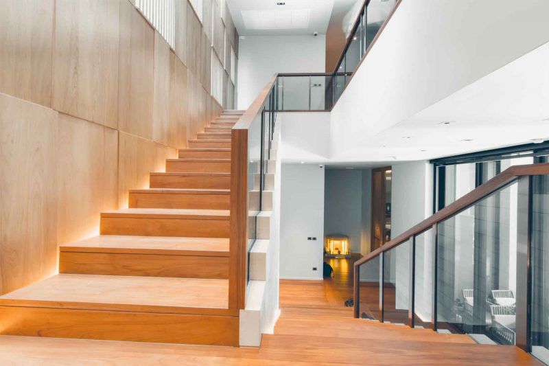 ในงานออกแบบพื้นที่โถงบันไดซึ่งมีขนาดใหญ่ ผู้ออกแบบได้แก้ปัญหาด้วยการแยกเฟรมของแผ่นบันไดลูกนอนกับผนังด้านข้างออกจากกันด้วยการซ่อนไฟไว้รอบๆ ทำให้บันไดดูเหมือนลอยออกมาจากผนัง และออกแบบให้แสงธรรมชาติส่องมาในบริเวณบันได ด้วยการทำ Sky Light จากด้านบนหลังคา และเจาะช่องผนังให้แสงสว่างลอดเข้ามาจากทางด้านข้างได้ด้วย