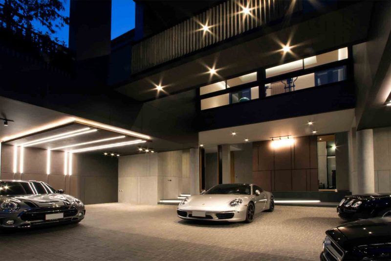 เจ้าของบ้านเป็นคนรักรถ เก็บสะสมรถยนต์ไว้หลายคัน งานออกแบบส่วนของพื้นที่จอดรถจึงมีการตกแต่งสไตล์ Loft เท่ๆ มีพื้นผิว(texture) ขรุขระของงานตกแต่งที่โดดเด่นและน่าสนใจ