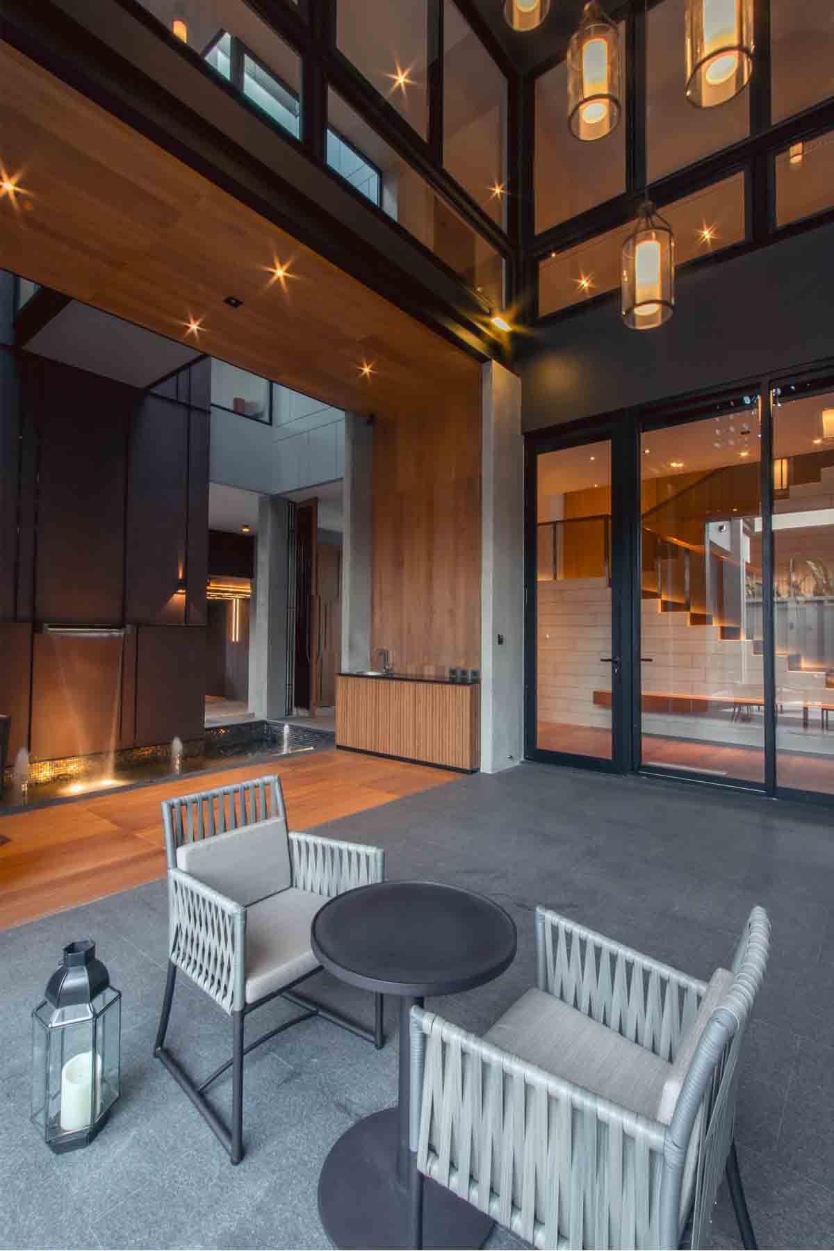 โดยระหว่างห้องนอนชั้นล่าง ห้องนอนmaster และห้องนอนรับแขกชั้นบน ทุกห้องจะมองเห็นแกนหลักของบ้านที่เป็น semi-outdoor มีทั้งโต๊ะทานข้าวใหญ่ พื้นที่เตรียมอาหาร จะเป็นจุดศูนย์รวมของคนในบ้าน ที่มีการออกแบบผนังฉลุวงกลมสีดำ และ chandelier แก้วกลมห้อยลงมาข้างล่าง เพื่อทำให้พื้นที่บริเวณนี้รู้สึกถึงความต่อเนื่อง ความกลมกลืนกันมีความ harmony