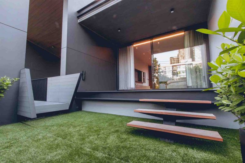 การออกแบบทางเข้าบ้านแบบ semi-indoor ให้พื้นที่ของการเข้าสู่โถงของบ้านแต่ละช่วงแบ่งตามลำดับความเป็นส่วนตัว (private)
