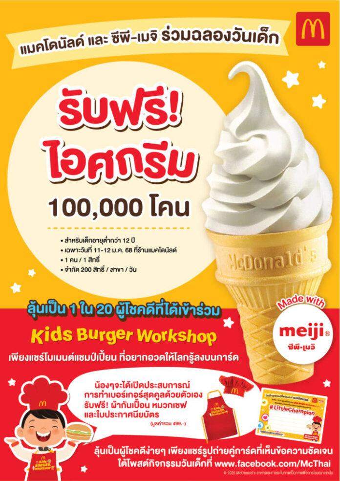แมคโดนัลด์ และ ซีพี-เมจิ ชวนมาฉลองวันเด็กแห่งชาติที่แมคโดนัลด์ เติมความสุขให้กับคุณหนู ๆ ที่อายุต่ำกว่า 12 ปี (จำกัด 1 คน ต่อ 1 สิทธิ์) ด้วยไอศกรีมสุดอร่อย จำนวน100,000 โคน* พร้อมลุ้นเป็น 1 ใน 20 ผู้โชคดีที่จะได้ร่วมเปิดประสบการณ์กับกิจกรรมสุดเอ็กซ์คลูซีฟ Kids Burger Workshop ทำเบอร์เกอร์สุดคูลในแบบฉบับของตัวเอง รับฟรี! ผ้ากันเปื้อน หมวกเชฟ ใบประกาศนียบัตร