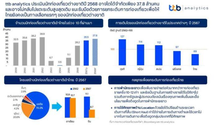 ttb analytics ประเมินนักท่องเที่ยวต่างชาติปี 2568 อาจโตได้จำกัดเพียง 37.8 ล้านคน และอาจไม่กลับไปแตะระดับสูงสุดเดิม แนะรับมือด้วยการยกระดับการท่องเที่ยวเพื่อให้ไทยยังคงเป็นทางเลือกแรกๆ ของนักท่องเที่ยวต่างชาติ
