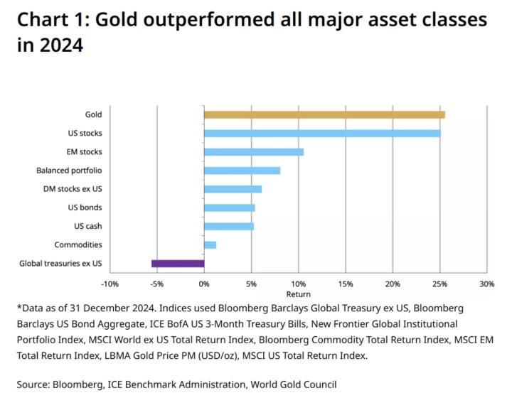 ทองคำมีผลการดำเนินงานที่ยอดเยี่ยมในปี 2567 ที่ผ่านมา โดยปรับตัวเพิ่มขึ้นถึง 25.5% สูงกว่าสินทรัพย์หลักประเภทอื่น ๆ ทั้งหมด ซึ่งน่าจะเป็นผลมาจากบทบาทของทองคำในการป้องกันความเสี่ยงจากความไม่แน่นอนทางภูมิรัฐศาสตร์และความผันผวนของตลาดที่เพิ่มขึ้นในปีที่ผ่านมา โดยตลอดทั้งปีราคาทองคำจากสมาคมตลาดทองคำแห่งลอนดอนที่ทำการซื้อขายช่วงบ่าย (LBMA Gold Price PM) ได้ทำสถิติแตะระดับสูงสุดใหม่ถึง 40 ครั้ง โดยราคาสูงสุดตลอดกาล (All-Time High) ของทองคำครั้งล่าสุดนั้นอยู่ที่ 2,777.80ดอลลาร์สหรัฐต่อออนซ์ เมื่อวันที่ 30 ตุลาคม 2567 ที่ผ่านมา