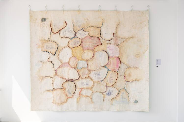 “มิตร ใจอินทร์ ศิลปินร่วมสมัยผู้มีความหลากหลายในการสร้างสรรค์ผลงาน ทั้งจิตรกรรม ประติมากรรม และศิลปะจัดวาง จุดเด่นของศิลปินคือการใช้สีที่มาจากธรรมชาติด้วยโทนสีที่มีความโปร่งและเบาสบาย ผลงานชิ้นนี้เป็นงานยุคเก่า ซึ่งการจุดสียังมีขนาดใหญ่ ถึงแม้ผลงานจะแสดงความเรียบง่ายแต่ก็ซ่อนไว้ซึ่งกลวิธีที่ซ้ำซ้อน อีกทั้งเป็นผลงานที่ต้องอาศัยแรงกายในการสร้างสรรค์ขึ้น ลักษณะของผลงานชิ้นนี้เป็นผ้าใบที่ลงสีพื้นไว้เป็นชั้น ๆ ต่อมาลงสีหนา ๆ ไว้ข้างบน เมื่อเกิดรอยแตกของสีด้านบนจึงเง้มเผยให้เห็นร่องรอยที่จงใจสร้างไว้”