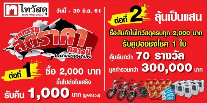 พิเศษสุดสำหรับสมาชิก The 1 Card ต่อที่ 1 ช้อปครบ 2,000 บาทขึ้นไป รับคืนคูปองส่วนลดมูลค่ารวม 1,000 บาท ทันที ต่อที่ 2 ลุ้นเป็นแสน เมื่อช้อปครบ 2,000 บาท รับคูปองชิงโชค 1 ใบ ลุ้นรถจักรยานยนต์ สร้อยคอทองคำ บัตรกำนัลเงินสด และรางวัลอื่นๆอีกมากมายกว่า 70 รางวัล มูลค่ารวมกว่า 300,000 บาท ประกาศผลผู้โชคดีวันที่ 20 กรกฎาคม 2561 ทาง www.thaiwatsadu.com, facebook  thaiwatsadu และที่ร้านไทวัสดุทุกสาขา