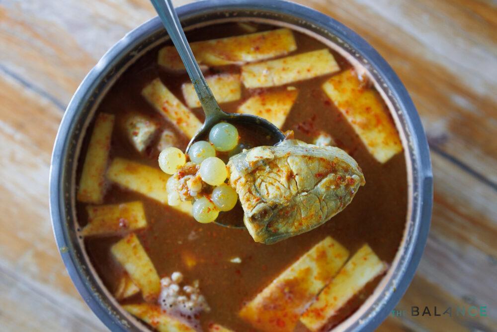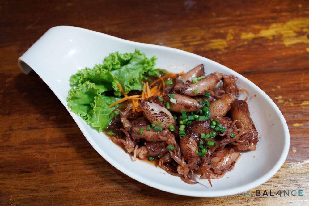 มาแล้วต้องลองเมนูอันเป็นเอกลักษณ์ของทางร้าน เช่น หมึกไข่น้ำดำ และ แกงส้มใบกะเพรา สูตรของคนในพื้นที่ รวมทั้ง “แกงคั่วสับปะรดไข่แมงดา” เป็นสูตรดั้งเดิมจากคุณแม่ของเจ้าของร้าน เมนูนี้เด็ดที่เครื่องแกงหอม ใช้สับปะรดพันธุ์หอมสุวรรณของดีประจำถิ่น แกงกับไข่แมงดาขนาดกำลังกิน มีความมัน เคี้ยวหนึบ 2568 มีเครื่องเคียงเป็นหมึกกะตอยและปลาลิ้นหมาทอด พร้อมข้าวไรซ์เบอรี่