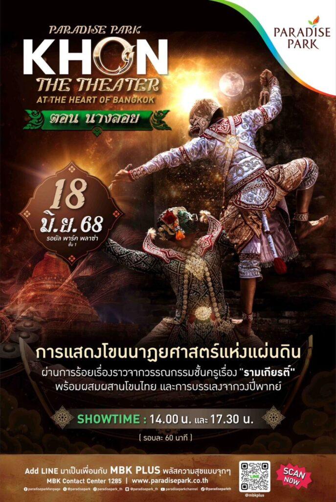 เดือนมิถุนายนนี้ พาราไดซ์ พาร์ค ศูนย์การค้าในเครือเอ็ม บี เค พร้อมพาคุณไปดื่มด่ำกับศิลปะการแสดงชั้นสูงของไทยอย่างต่อเนื่อง โขนนาฏยศาสตร์แห่งแผ่นดิน PARADISE PARK KHON THE THEATER ครั้งนี้จัดแสดงโขน เรื่อง รามเกียรติ์ ตอน นางลอย