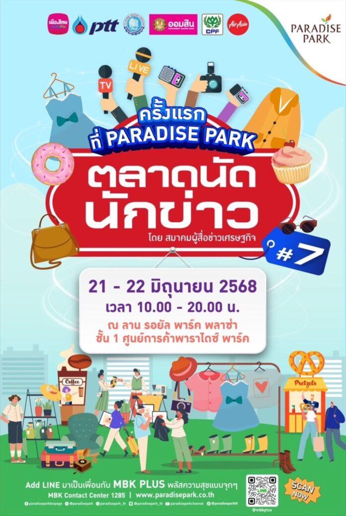 สมาคมผู้สื่อข่าวเศรษฐกิจ ร่วมกับพาราไดซ์ พาร์ค ศูนย์การค้าในเครือเอ็ม บี เค ชวนคุณมาร่วมเปิดประสบการณ์ช้อปสุดพิเศษกับ “ตลาดนัดนักข่าว ครั้งที่ 7” ภายในงานพบกับกิจกรรมให้ร่วมสนุกรับรางวัลมากมาย และบูทสินค้าคุณภาพที่คัดสรรจากพี่ ๆ น้อง ๆ สื่อมวลชนสายเศรษฐกิจ ให้คุณได้เลือกช้อปชิมชิลอย่างจุใจ กว่า 30 บูท อาทิ เสื้อผ้า เครื่องประดับ สินค้าของที่ระลึก และอาหารทั้งคาว-หวาน พร้อมเสิร์ฟความอร่อยแบบจัดเต็ม