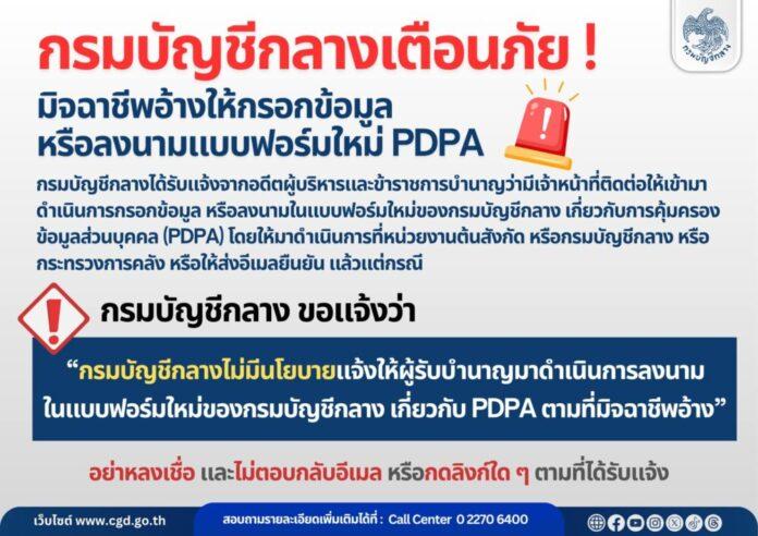 ในแบบฟอร์มใหม่ของกรมบัญชีกลาง เกี่ยวกับการคุ้มครองข้อมูลส่วนบุคคล (PDPA) โดยให้มาดำเนินการที่หน่วยงานต้นสังกัด หรือกรมบัญชีกลาง หรือกระทรวงการคลัง แล้วแต่กรณี และในบางกรณีให้ส่งอีเมลยืนยัน กรมบัญชีกลาง ขอแจ้งว่า “กรมบัญชีกลางไม่มีนโยบายแจ้งให้ผู้รับบำนาญ มาดำเนินการกรอกข้อมูลหรือลงนามในแบบฟอร์มใหม่ของกรมบัญชีกลาง เกี่ยวกับ PDPA ตามที่มิจฉาชีพอ้าง” ดังนั้น ขอให้ท่านที่ได้รับการติดต่อในลักษณะดังกล่าว อย่าหลงเชื่อ ไม่ตอบกลับอีเมล หรือกดลิงก์ใด ๆ ตามที่ได้รับแจ้ง