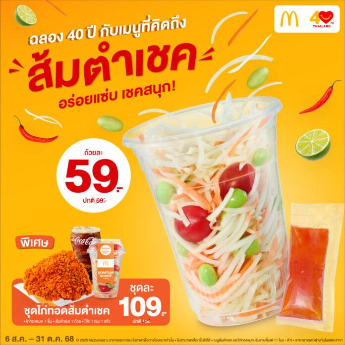 แมคโดนัลด์ เสิร์ฟเมนูในตำนานที่ทุกคนคิดถึง! ฉลองครบรอบ 40 ปี กับ ‘ส้มตำเชค’ ส้มตำไทยสุดอร่อย ชวนให้เชคสนุกถึงรสง่าย ๆ เพียงแค่ฉีกซอง เทซอสน้ำส้มตำสุดแซ่บ แล้วเชค ๆ ให้คลุกเคล้ากับส่วนผสมทั้งมะละกอ, แครอท, มะเขือเทศ และถั่วแระญี่ปุ่น ในราคาเริ่มต้นเพียงถ้วยละ 59 บาท