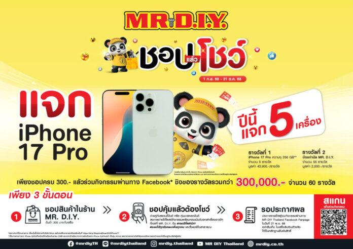 โดยปีนี้พิเศษยิ่งกว่าเดิม ลูกค้ามีสิทธิ์ร่วมชิงรางวัล iPhone 17 Pro(2) ถึง 5 เครื่อง พร้อมบัตรของขวัญ MR. D.I.Y. รวมมูลค่ากว่า 300,000 บาท เพียงซื้อสินค้าที่ร้านมิสเตอร์. ดี.ไอ.วาย. ครบ 300 บาท/ใบเสร็จ สามารถร่วมกิจกรรม “ชอป แล้ว โชว์” ได้ตลอดเดือนกันยายน – ตุลาคม 2568 นี้ กิจกรรมนี้ยังสะท้อนถึงความตั้งใจของเรา ที่อยากให้การมาที่ร้านมิสเตอร์. ดี.ไอ.วาย. เป็นมากกว่าการชอปปิง แต่ยังเป็นการสร้างประสบการณ์ดีๆ ที่คุ้มค่าและเต็มไปด้วยรอยยิ้ม เพื่อให้ทุกคนได้ เจอดีที่ มิสเตอร์. ดี.ไอ.วาย.”