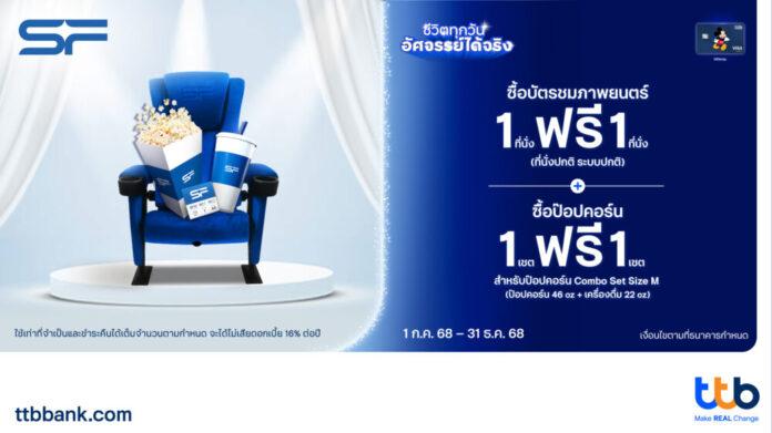 ทีเอ็มบีธนชาต หรือ ทีทีบี ร่วมกับ SF Cinema เชิญชวนคนรักการชมภาพยนตร์มาร่วมสัมผัสประสบการณ์ความคุ้มแบบคูณสอง โดยมอบสิทธิพิเศษเฉพาะผู้ถือบัตรเครดิต ttb Disney คุ้มที่ 1 เพียงซื้อบัตรชมภาพยนตร์จำนวน 1 ที่นั่ง รับฟรี 1 ที่นั่ง (ที่นั่งปกติ ระบบปกติ) ผ่านช่องทางเครื่องจำหน่ายตั๋วอัตโนมัติ Express Ticket, SF Application และ SF Website