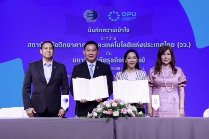 กระทรวงการอุดมศึกษา วิทยาศาสตร์ วิจัยและนวัตกรรม (อว.) โดย ผศ.ดร.วีรชัย อาจหาญ ผู้ว่าการ สถาบันวิจัยวิทยาศาสตร์และเทคโนโลยีแห่งประเทศไทย (วว.) และ ดร.ดาริกา ลัทธพิพัฒน์ อธิการบดี มหาวิทยาลัยธุรกิจบัณฑิตย์ (DPU) ร่วมลงนามบันทึกข้อตกลงความเข้าใจว่าด้วยความร่วมมือในการศึกษา วิจัย และเชื่อมโยงเครือข่ายการพัฒนาผลิตภัณฑ์เพื่อส่งเสริมการมีสุขภาพที่ดี โดยมี ดร.พงศธร ประภักรางกูล รองผู้ว่าการวิจัยและพัฒนาด้านอุตสาหกรรมชีวภาพ วว. และ ผศ.ดร.พัทธนันท์ เพชรเชิดชู รองอธิการบดีสายงานวิชาการและวิจัย ร่วมเป็นสักขีพยาน