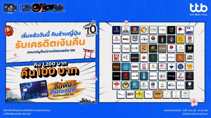 ทีเอ็มบีธนชาต หรือ ทีทีบี พร้อมเสิร์ฟความสุขเอาใจสายกินจริงจังให้ผู้ถือบัตรเครดิต ttb บัตรเครดิต ttb Global House และบัตรเครดิต ttb Disney ได้อิ่มอร่อยแบบจัดเต็มกับแคมเปญ “อิ่มฟิน อินเจแปน” กิน 1,200 บาทขึ้นไป / เซลล์สลิป รับเครดิตเงินคืน 100 บาท (จำกัดเครดิตเงินคืน 100บาท / เซลล์สลิป และสูงสุด 400 บาท / ท่าน ตลอดรายการ) กับร้านอาหารญี่ปุ่นชื่อดังทั่วประเทศมากกว่า 70 ร้าน