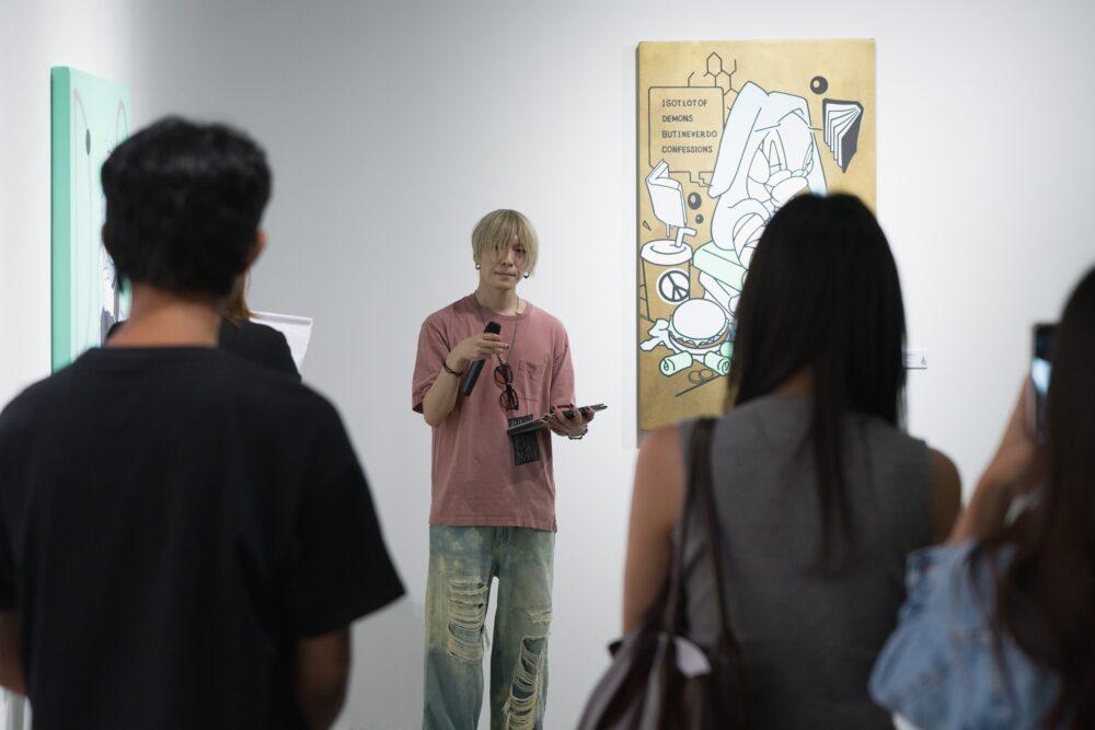 ด้วยลายเส้นที่เป็นอิสระ สีสันอันโดดเด่น และพลังความสนุกในสไตล์กราฟฟิตี้ นิทรรศการนี้ชวนผู้ชมออกสำรวจความเชื่อมโยงระหว่างโลกภายนอกกับโลกภายในอันคาดเดาไม่ได้ เพื่อค้นหาความหมายและสายใยเล็ก ๆ ที่ซ่อนอยู่ในทุกมิติของชีวิตแม้ศิลปะแนวกราฟฟิตี้มักถูกมองว่ามีลักษณะแบนราบหรือลวดลายซ้ำ ๆ แต่อารุตะ ซุปได้ท้าทายขอบเขตเหล่านั้นด้วยแนวทางที่ยึดมั่นกับจิตวิญญาณของวิจิตรศิลป์ ผ่านลายเส้นพลิ้วไหวและความเชี่ยวชาญในการใช้สีซึ่งสะท้อนวิสัยทัศน์ส่วนตัวของเขา