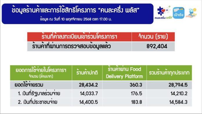 วินิจ วิเศษสุวรรณภูมิ ผู้อำนวยการสำนักงานเศรษฐกิจการคลัง ในฐานะโฆษกกระทรวงการคลัง เปิดเผยความคืบหน้าการใช้สิทธิโครงการคนละครึ่ง พลัส (โครงการฯ) โดย ณ วันที่ 10 พฤศจิกายน 2568 เวลา 17.00 น. มีผู้ใช้จ่ายผ่านโครงการฯ สำเร็จแล้วกว่า 19.61 ล้านราย ยอดใช้จ่ายรวมกว่า 28,794.52 ล้านบาท โดยแบ่งเป็นเงินที่ประชาชนใช้จ่ายผ่านร้านค้าทั่วไปจำนวน 14,400.51 ล้านบาท และใช้จ่ายผ่านผู้ให้บริการระบบขนส่งอาหาร (Food Delivery Platform) จำนวน 183.84 ล้านบาท และเงินที่รัฐร่วมจ่ายร้านค้าทั่วไปจำนวน 14,033.66 ล้านบาท และร่วมจ่ายผ่าน Food Delivery Platform จำนวน 176.51 ล้านบาท