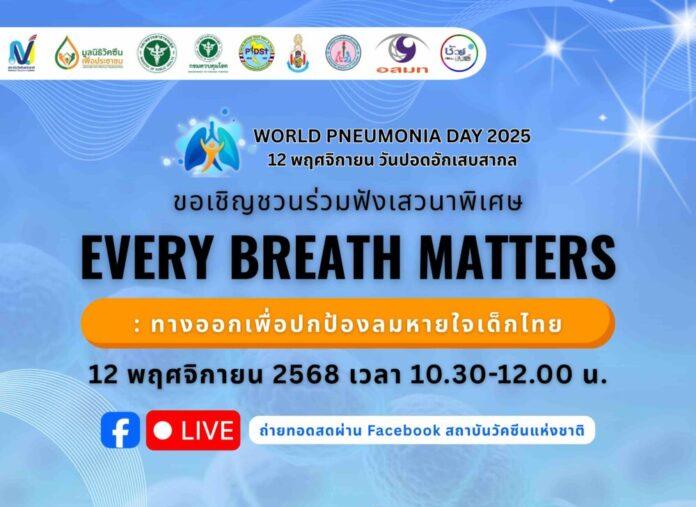 สถาบันวัคซีนแห่งชาติ จึงร่วมกับ มูลนิธิวัคซีนเพื่อประชาชน กรมควบคุมโรค ราชวิทยาลัยกุมารแพทย์แห่งประเทศไทย สมาคมกุมารแพทย์แห่งประเทศไทย และสมาคมโรคติดเชื้อในเด็กแห่งประเทศไทย จัดงาน World Pneumonia Day 2025 – Stop Pneumonia, Save Lives เด็กไทยต้องปลอดภัยจากโรคร้ายที่ป้องกันได้ด้วยวัคซีน” เพื่อรณรงค์สร้างความตระหนักรู้ถึงความรุนแรงของโรคปอดอักเสบและความสำคัญของการเข้าถึงวัคซีนป้องกันโรคปอดอักเสบในเด็กเล็ก เพื่อให้ “ทุกลมหายใจของเด็กไทย” เติบโตไปอย่างปลอดภัยและแข็งแรง และไม่ต้องเสี่ยงกับโรคที่ป้องกันได้ด้วยวัคซีน เนื่องในวันปอดอักเสบสากล ในวันที่ 12 พฤศจิกายน 2568 เวลา 09.00-12.00น. ณ ห้องออดิทอเรียม ชั้น 6 อาคารปฏิบัติการวิทยุโทรทัศน์ บริษัท อสมท จำกัด (มหาชน)