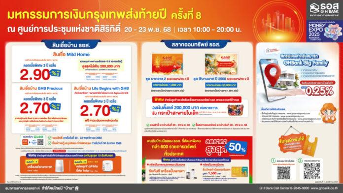 งาน “มหกรรมการเงินกรุงเทพส่งท้ายปี ครั้งที่ 8 (MONEY EXPO 2025 BANGKOK – YEAR END)” จัดขึ้นระหว่างวันที่ 20 – 23 พฤศจิกายน 2568 ณ ศูนย์การประชุมแห่งชาติสิริกิติ์ สามารถสอบถามรายละเอียดเพิ่มเติมได้ที่ ธอส. ทุกสาขาทั่วประเทศ G H Bank Call Center โทร 0-2645-9000, Website : www.ghbank.co.th หรือ Facebook Fanpage ธนาคารอาคารสงเคราะห์ และติดตามข่าวสารของธนาคารได้ที่ GHBank Social Media