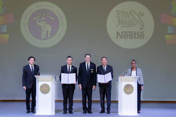 นายวิคเตอร์ เซียห์ ประธานกรรมการและประธานคณะผู้บริหาร เนสท์เล่ อินโดไชน่า กล่าวว่า “เนสท์เล่ ประเทศไทย ดำเนินธุรกิจโดยให้ความสำคัญกับการสร้างความยั่งยืนตลอดห่วงโซ่คุณค่า ตั้งแต่ฟาร์มจนถึงมือผู้บริโภค เพื่อบรรลุเป้าหมายสำคัญ Net Zero 2050 นอกเหนือจากนั้น เรายังมุ่งมั่นที่จะสร้างการเปลี่ยนแปลงร่วมกับผู้บริโภค ด้วยความเชื่อมั่นในพลังของเยาวชนไทย เราจึงให้ความสำคัญกับการส่งเสริมศักยภาพของคนรุ่นใหม่ ที่จะเป็นผู้สร้างความเปลี่ยนแปลงในอนาคต ผมมีความยินดีเป็นอย่างยิ่งที่ได้ลงนามความร่วมมือกับมหาวิทยาลัยเชียงใหม่ ในการนำหลักสูตรด้านความยั่งยืนในรูปแบบใหม่ ภายใต้ชื่อหลักสูตร Sustainability Beyond Business: Insight–Action–Solution มาเปิดสอนเป็นครั้งแรกในประเทศไทย ซึ่งหลักสูตรนี้ จะเป็นประตูที่เปิดโอกาสให้เยาวชนได้เรียนรู้จากผู้มีประสบการณ์จริง และเข้าใจถึงการผสานเรื่องของความยั่งยืนในภาคธุรกิจ รวมทั้งสร้างชุมชนแห่งความยั่งยืน ที่สามารถทำงานร่วมกัน พร้อมแลกเปลี่ยนและต่อยอดความรู้และประสบการณ์ อันจะเป็นรากฐานในการช่วยขับเคลื่อนความยั่งยืนของประเทศไทยไปสู่อนาคต”