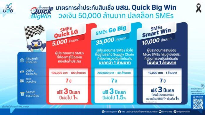 ทั้งนี้ มาตรการค้ำประกันสินเชื่อ “บสย. Quick Big Win” ถือเป็น “มาตรการพิเศษ” เพื่อช่วยเหลือ SMEs ในภาวะเศรษฐกิจที่ผันผวนจากปัจจัยลบรอบด้าน โดยมีเป้าหมายสำคัญเพื่อกระตุ้นให้สถาบันการเงินปล่อยสินเชื่อให้กับ SMEs ในรายที่ต้องการสภาพคล่องเพิ่มเติม แต่ขาดหลักทรัพย์ค้ำประกัน โดยเฉพาะ “กลุ่มเปราะบาง” ผู้ประกอบการรายย่อย Micro SMEs กลุ่มอาชีพอิสระ ที่มีปัญหาเข้าไม่ถึงสินเชื่อในระบบ ด้วยการจ่ายเคลม (จ่ายค่าประกันชดเชย) ในอัตราสูง หรือ Max Claim เมื่อเทียบกับโครงการค้ำประกันสินเชื่อโครงการอื่นๆ ซึ่งถือเป็นการดูดซับความเสี่ยงด้าน Credit Cost และเพิ่มโอกาสด้านเครดิต (Credit Enhancement) ให้กับ SMEs เพื่อลดอัตราการปฏิเสธสินเชื่อ (Rejection Rate) และทำให้สถาบันการเงินมีความเชื่อมั่นในการพิจารณาสินเชื่อเพิ่มให้กับSMEs มากยิ่งขึ้น