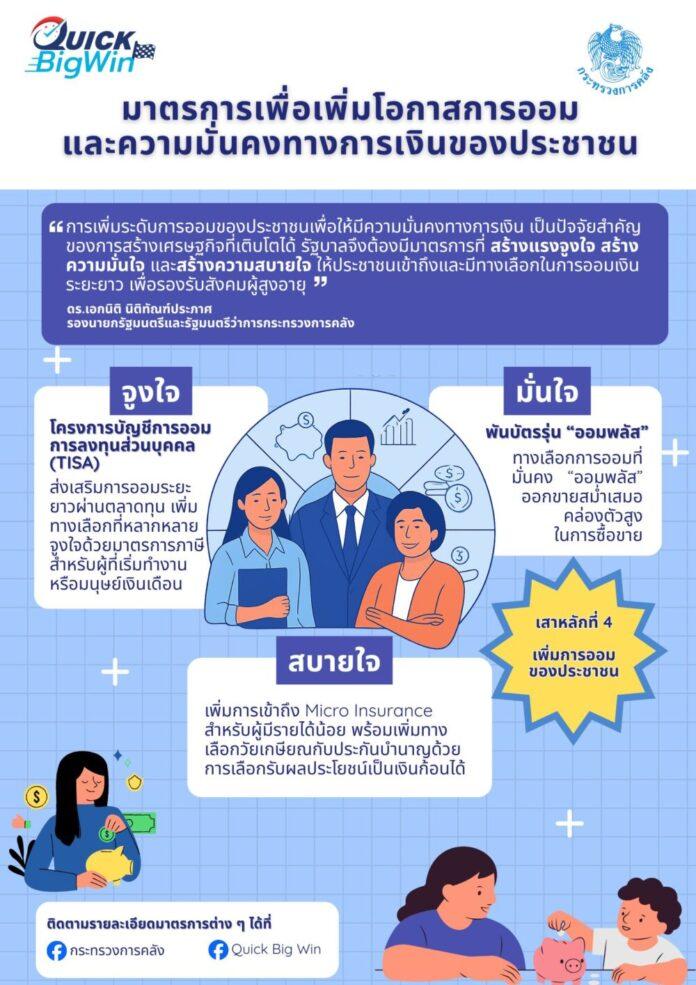 กระทรวงการคลัง  ประกาศมาตรการ Quick Big Win เสาที่ 4 การเพิ่มโอกาสการออมและความมั่นคงทางการเงินของประชาชน