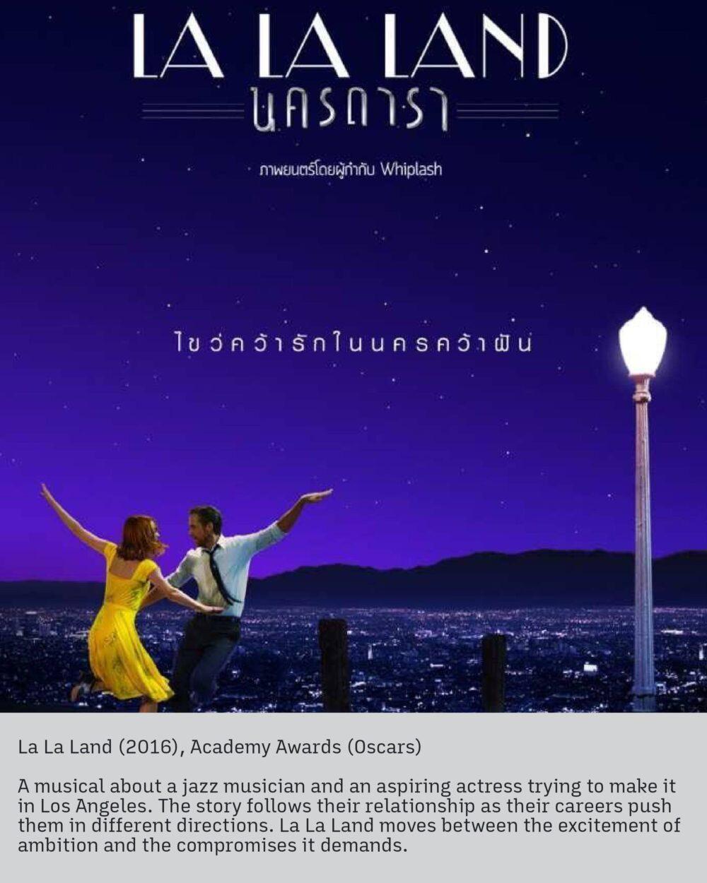 ภาพยนตร์เพลงสุดโรแมนติกเล่าชีวิตของนักดนตรีแจ๊สและนักแสดงสาวผู้เปี่ยมด้วยความมุ่งมั่น ทั้งคู่ต่างไล่ล่าความฝันอันยิ่งใหญ่ในเมืองแห่งดารา พร้อมพาเราไปสัมผัสเรื่องราวความรักของพวกเขาที่ต้องแยกจากกัน เพราะความแตกต่างของเส้นทางอาชีพ La La Land เลื่อนไหลอย่างลงตัวระหว่างความน่าตื่นเต้นของการไล่คว้าฝันกับสิ่งที่ต้องแลกมาจากความทะเยอทะยานของเขาและเธอ