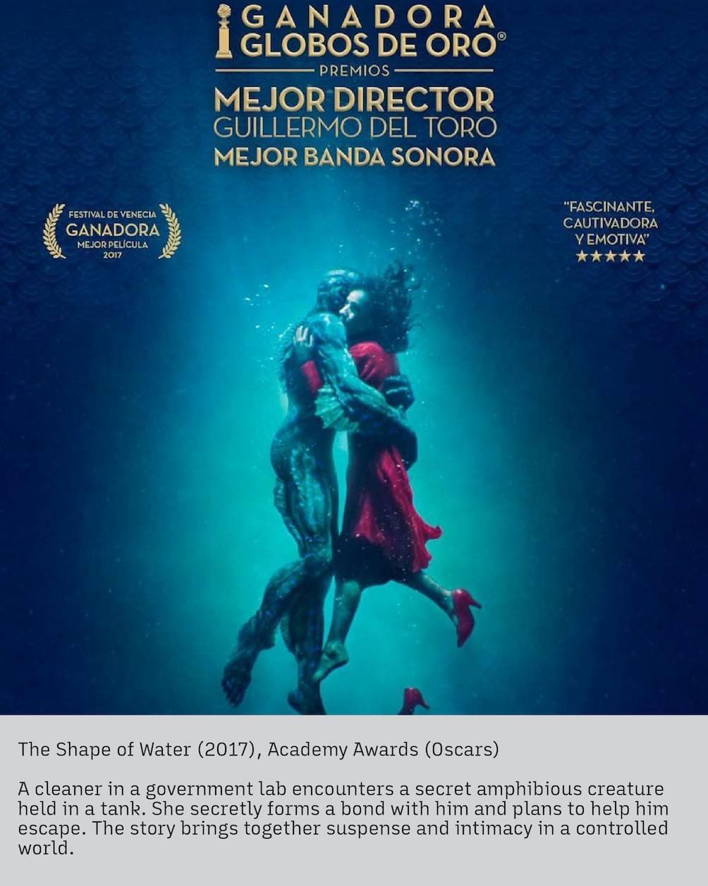 ภายในห้องทดลองลับของรัฐบาล พนักงานทำความสะอาดหญิงพบสิ่งมีชีวิตประหลาดกึ่งมนุษย์กึ่งสัตว์น้ำที่ถูกกักตัวไว้ในแท็งก์ เธอค่อย ๆ สร้างสายสัมพันธ์ลับกับเขา ก่อนตัดสินใจวางแผนพาหลบหนี The Shape of Water ผสานความระทึกเข้ากับความละเมียดละไม ถ่ายทอดความผูกพันท่ามกลางสภาพแวดล้อมที่ถูกควบคุมอย่างเข้มงวด