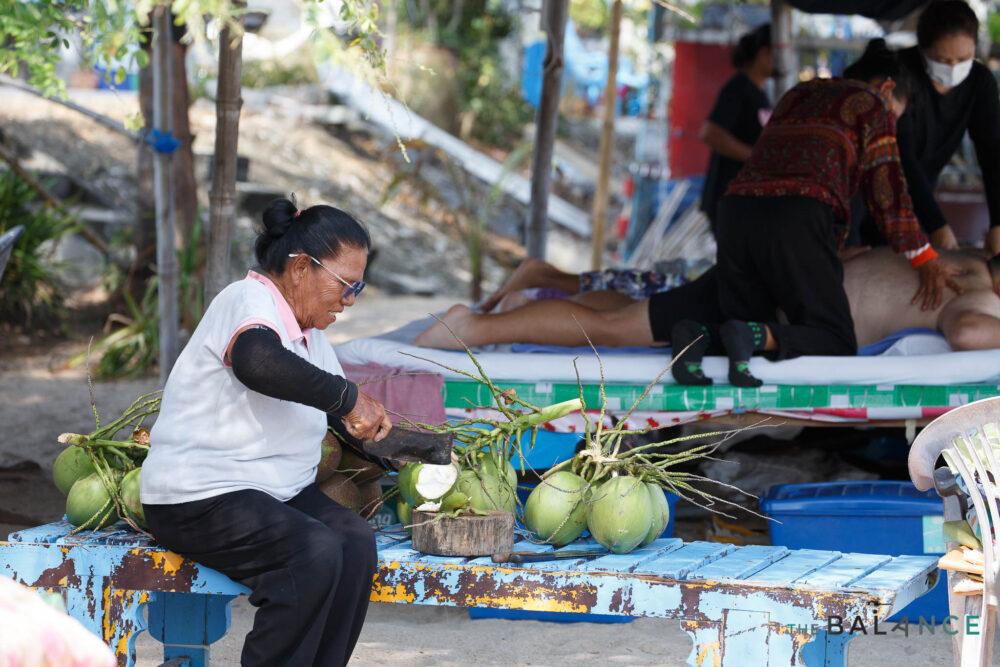 ริมชายหาดมีบรรดาคนในชุมชนดั้งเดิม (ซึ่งย้ายจากชายหาดไปอยู่บนฝั่ง) มาทำธุรกิจเล็ก ๆ น้อย ๆ เช่น ร้านอาหาร ร้านนวด บาร์ และขายของเล็ก ๆ น้อย ๆ อย่าง “ป้าชุบ” รู้จักกันในนาม “ป้าชุบปูเป็น” ที่เป็นตัวแทนจำหน่ายปูเป็นจากเรือประมง ป้ายังรับมะพร้าวน้ำหอมมาแช่เย็น ๆ ขายในราคา 40 – 60 บาท อีกบทบาทแกก็เป็นหมอนวดที่มีฝีมือ ใครผ่านไปผ่านมา ก็แวะไปทักทายป้าชุบได้ แกอยู่ที่นี่ทุกวันตั้งแต่เช้ายันเย็น