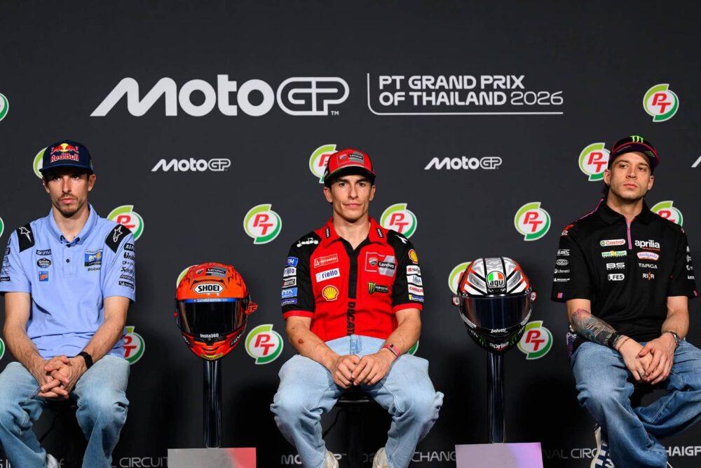 มาร์ค มาร์เกซ ยอดนักบิดสแปนิชแชมป์โลก 7 สมัย ควงคู่ อเล็กซ์ มาร์เกซ รองแชมป์โลก และ มาร์โก เบซเซ็คคี หนึ่งในตัวเต็งแถลงข่าวอย่างเป็นทางการ เปิดฉากศึกมอเตอร์สปอร์ตสองล้อเบอร์หนึ่งของโลกอย่าง “โมโตจีพี 2026” ที่เข้าสู่โปรแกรม “พรีเรซ” ที่ สนามช้าง อินเตอร์เนชั่นแนล เซอร์กิต จ.บุรีรัมย์ พร้อมการถ่ายภาพประวัติศาสตร์บันทึกทำเนียบนักบิดทุกรุ่น ก่อนดวลเดือดในรายการ “พีที กรังด์ปรีซ์ ออฟ ไทยแลนด์” สุดสัปดาห์นี้