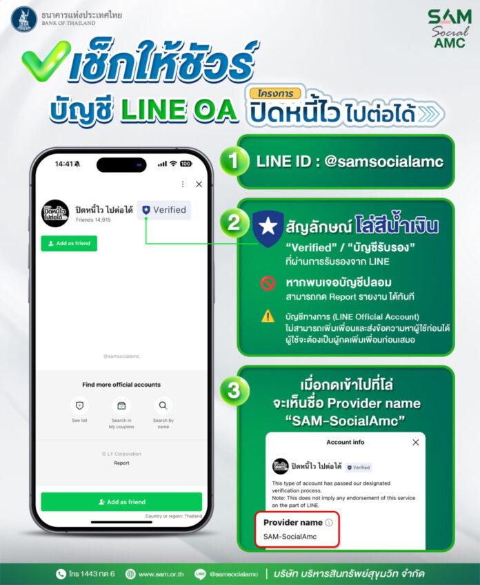 ทั้งนี้ ลูกค้าที่ผ่านคุณสมบัติเข้าโครงการฯ จะต้องยืนยันตัวตนผ่านช่องทาง LINE Official Account @samsocialamc โดยกรอกข้อมูลตามที่กำหนดให้ครบถ้วน และ SAM ขอให้ความเชื่อมั่นว่ากระบวนการแสดงตนของลูกค้าในโครงการ “ปิดหนี้ไว ไปต่อได้” ผ่านช่องทาง Line Official Account@samsocialamc มีความน่าเชื่อถือ ปลอดภัย อยู่ภายใต้มาตรฐานและสอดคล้องกับประกาศสำนักงาน ปปง. เรื่องแนวทางในการระบุตัวตนและพิสูจน์ทราบตัวตนของลูกค้า