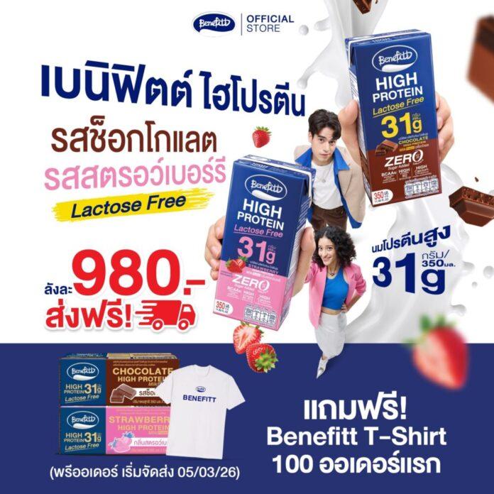 “เบนิฟิตต์ ไฮโปรตีน แลคโตสฟรี” นมยูเอชทีโปรตีนสูง 31 กรัม ประโยชน์เต็ม ๆ ปราศจากแลคโตส ไม่เติมน้ำตาลทราย เปิดพรีออเดอร์แล้ววันนี้ ในราคาพิเศษลังละ 980 บาท ส่งฟรี (จากปกติ 1,080 บาท) มีให้เลือก 2 รสชาติ ได้แก่ รสช็อกโกแลต และรสสตรอว์เบอร์รี เริ่มจัดส่งวันที่ 5 มีนาคม 69 พร้อมรับฟรี Benefitt T-Shirt แบบเอ็กซ์คลูซีฟเฉพาะ 100 ออเดอร์แรก