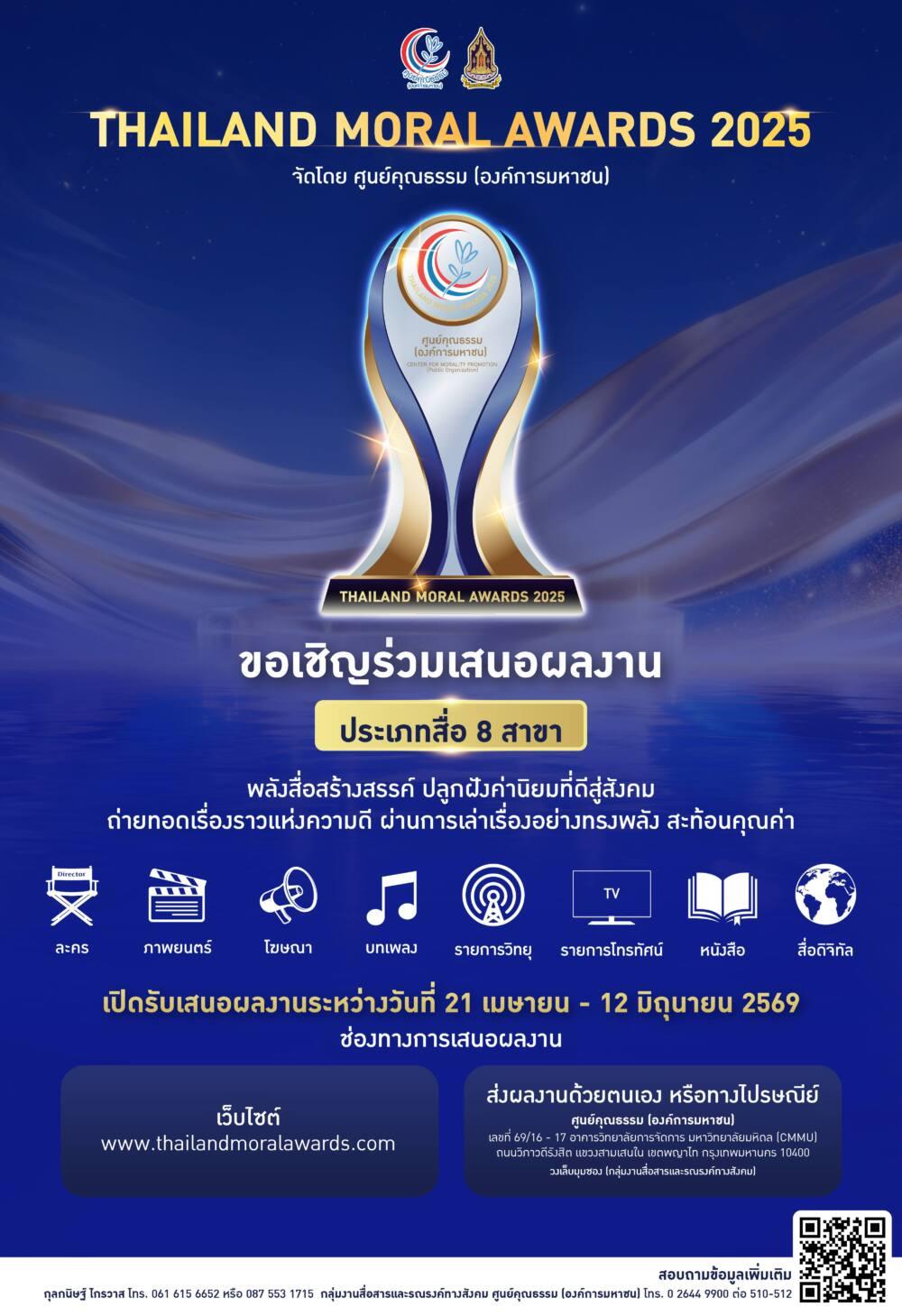 ศูนย์คุณธรรม (องค์การมหาชน) ขอเชิญชวนผู้ผลิตสื่อสร้างสรรค์ทั้ง 8 สาขาร่วมส่งผลงานชิงโล่รางวัล และเกียรติบัตร รางวัล THAILAND MORAL AWARDS 2025 ได้ที่www.thailandmoralawards.com หรือสมัครด้วยตนเอง หรือทางไปรษณีย์ ติดตามรายละเอียดเพิ่มเติมได้ที่เว็บไซต์ หรือ Facebook ศูนย์คุณธรรม Moral Center Thailand สอบถามรายละเอียดเพิ่มเติมได้ที่ กลุ่มงานสื่อสารและรณรงค์ทางสังคม ศูนย์คุณธรรม (องค์การมหาชน) โทร. 061 615 6652, 063 335 5746 , 0 2644 9900 ต่อ 510-512 และ 0 2184 2728-32